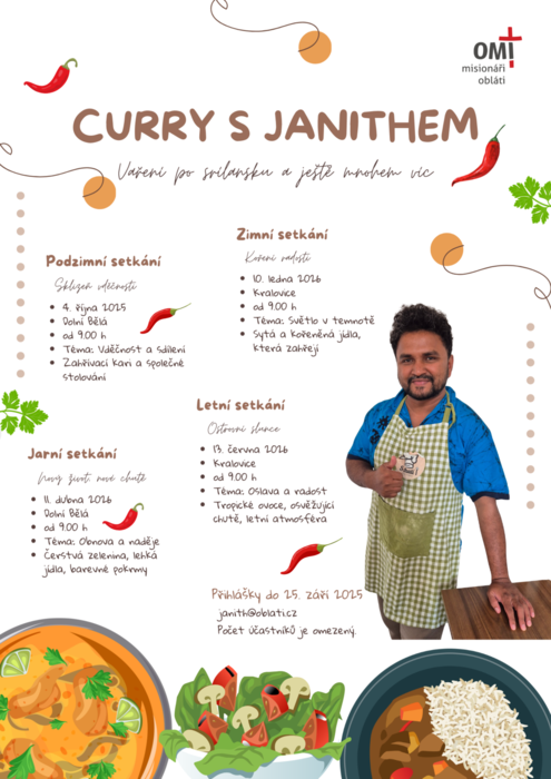 Zveme vás na Curry s Janithem! Po prvním úspěšném roce srílanského vaření otevíráme ročník druhý. Nejde zdaleka jen o růst v kulinářských dovednostech, ale také o zkušenost bohatství (nejen) srílanské kultury a především o tvoření a zakoušení společenství bez jazykových, národnostních, kulturních a jiných bariér. K účasti na kurzu je třeba se přihlásit. Počet účastníků je omezený! Těšíme se na vás!