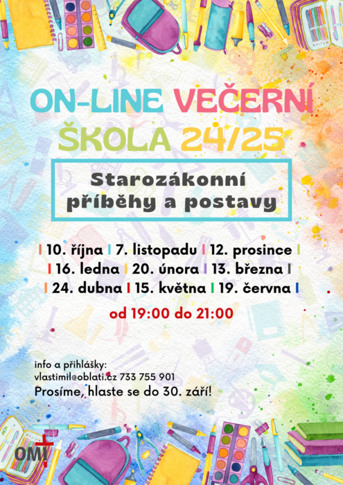Už popáté zveme všechny zájemce o prohloubení teologických znalostí a různých otázek naší víry do školy! V letošním roce se budeme zvláště věnovat vybraným kapitolám Starého zákona. Výuka a sdílení budou opět probíhat on-line prostřednictvím osvědčené platformy Zoom. Prosíme již "otřelé" studenty, ale i úplné nováčky, aby se do školy hlásili nejpozději do 30. září, a to na adresu vlastimil@oblati.cz